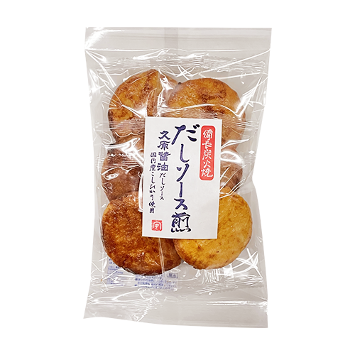 かつおの「だし感」醤油の「コク」野菜やフルーツの「甘み」のあるソースが特徴の、東急ストアオリジナル商品「だしソース」をじっくり生地にしみ込ませました。熟練の職人が一枚一枚丹念に備長炭で焼き上げた歯ごたえのある堅焼煎餅です。