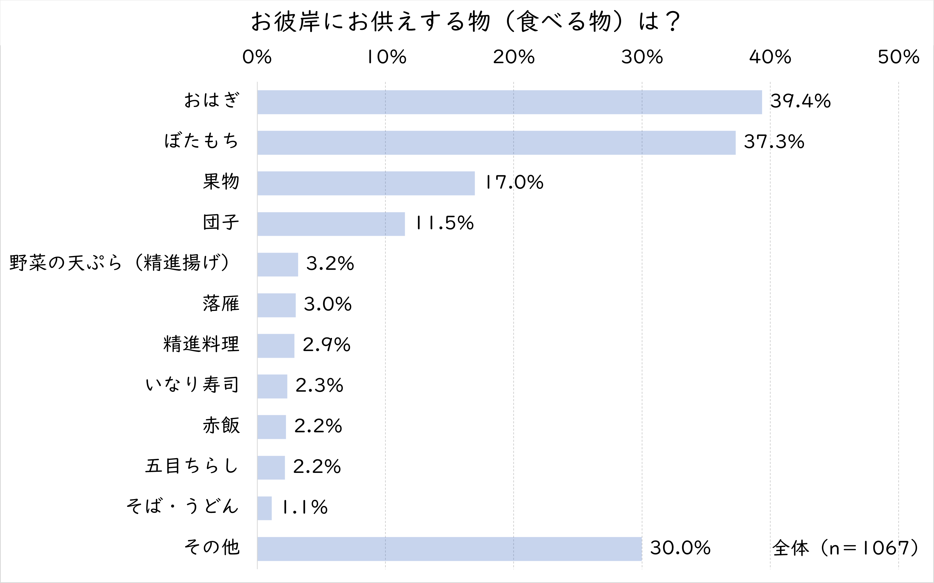 3番手には、お供え物の定番である「果物」(17.0%)、4番手には「団子」(11.5%)が続きます。